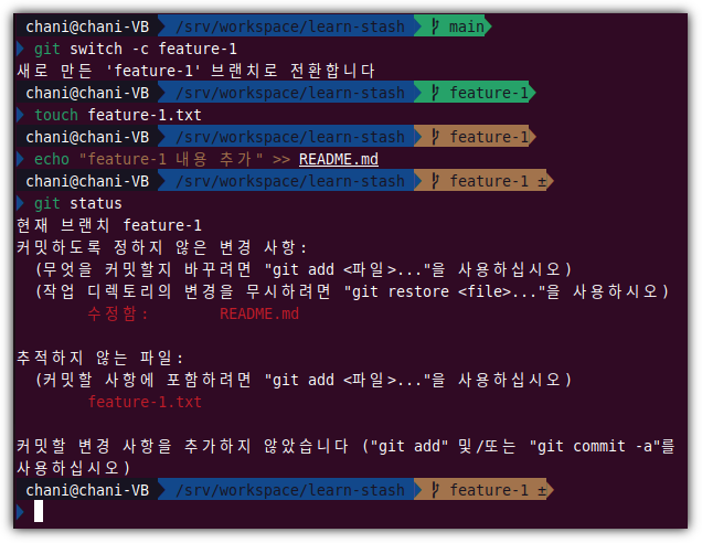 feature-1 작업은 아직 진행 중이기에 commit까지 할 상황은 아니지만