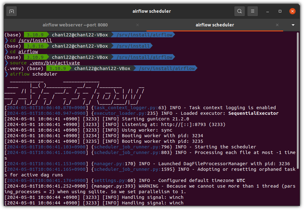 - 새로운 터미널을 추가로 띄워서 scheduler를 실행하면 된다.