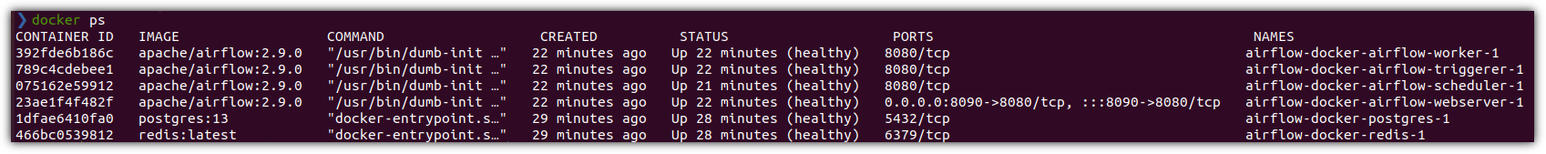 CONTAINER ID IMAGE COMMAND CREATED STATUS PORTS NAMES 1dfae6410fa0 postgres:13 "docker-entrypoint.s…" 4 minutes ago Up 4 minutes (healthy) 5432/tcp airflow-docker-postgres-1 466bc0539812 redis:latest "docker-entrypoint.s…" 4 minutes ago Up 4 minutes (healthy) 6379/tcp airflow-docker-redis-1
