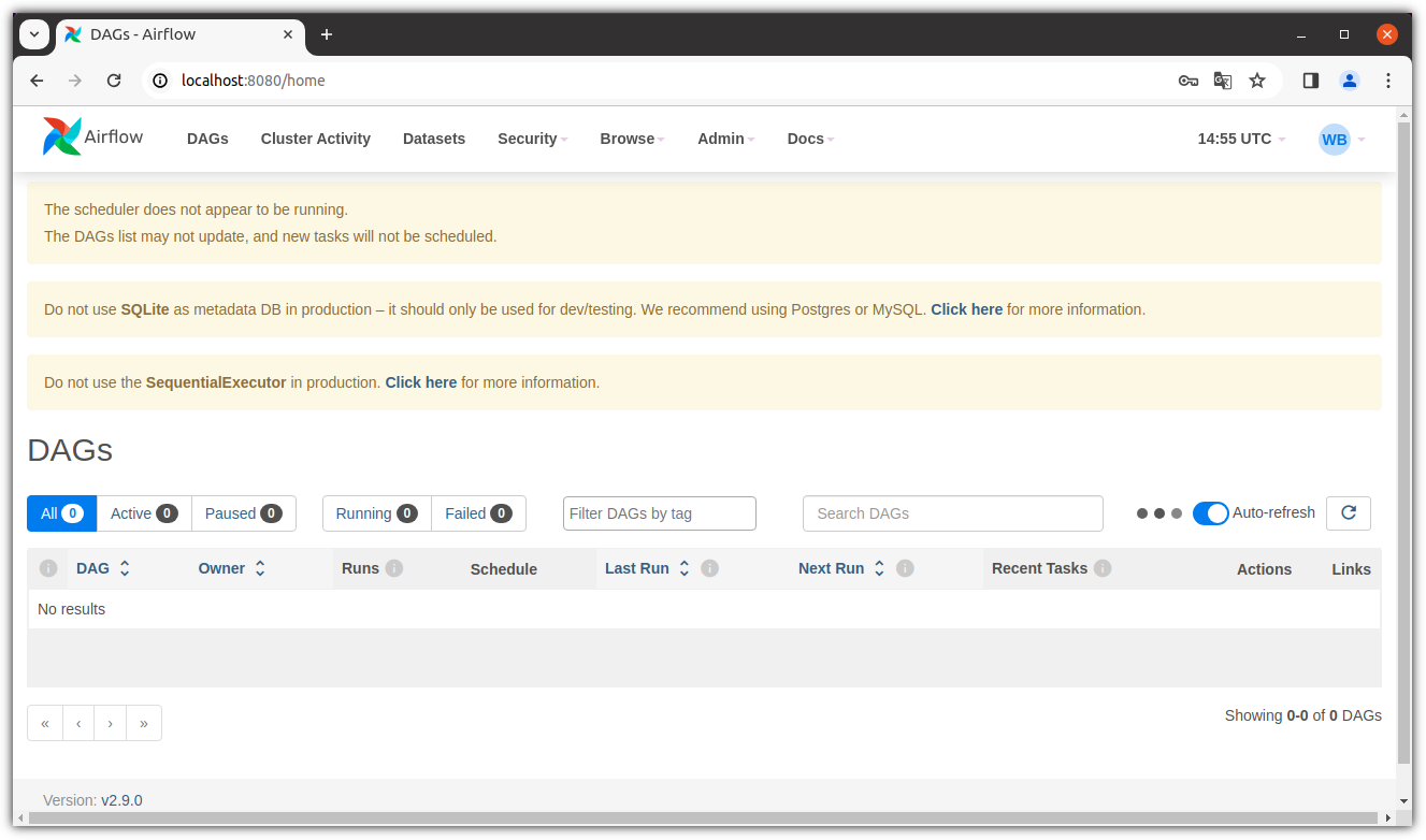 - 가장 위에 있는 메시지를 보면 실행중인 "scheduler"가 안보인단다. 해결해보자.
