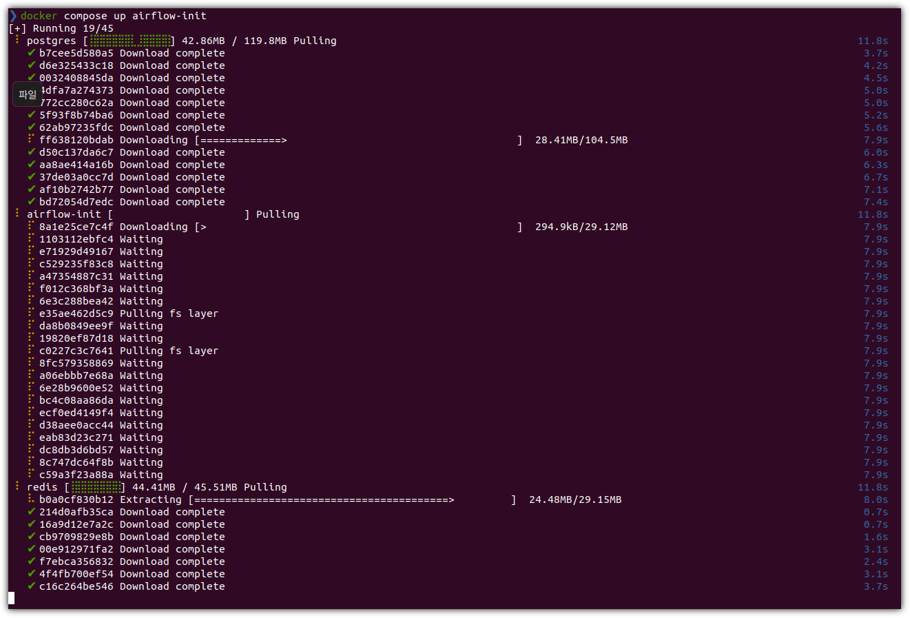 합계 40 drwxrwxr-x 6 chani22 chani22 4096 5월 1 11:00 . drwxr-xr-x 5 chani22 chani22 4096 5월 1 10:44 .. -rw-rw-r-- 1 chani22 chani22 17 5월 1 10:55 .env drwxrwxr-x 2 chani22 chani22 4096 5월 1 10:53 config drwxrwxr-x 2 chani22 root 4096 5월 1 10:53 dags -rw-rw-r-- 1 chani22 chani22 11197 5월 1 11:00 docker-compose.yaml drwxrwxr-x 2 chani22 root 4096 5월 1 10:53 logs drwxrwxr-x 2 chani22 root 4096 5월 1 10:53 plugins