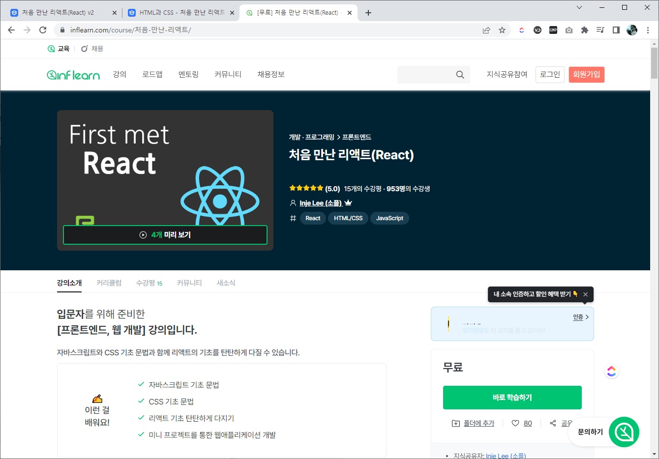'처음 만난 리액트(React) v2' 강의를 선택하면 된다!!!