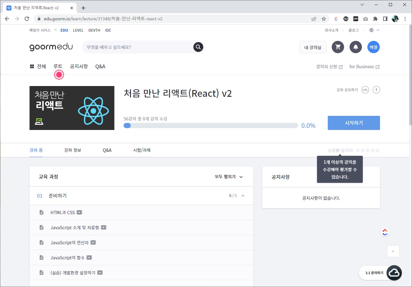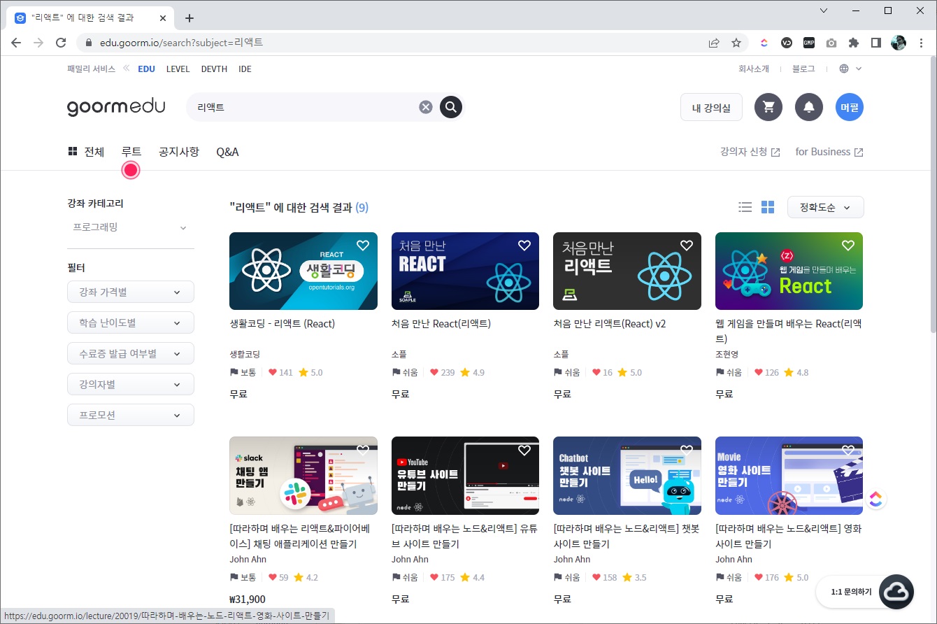 goormedu 사이트에서 '리액트'로 검색을 해보면