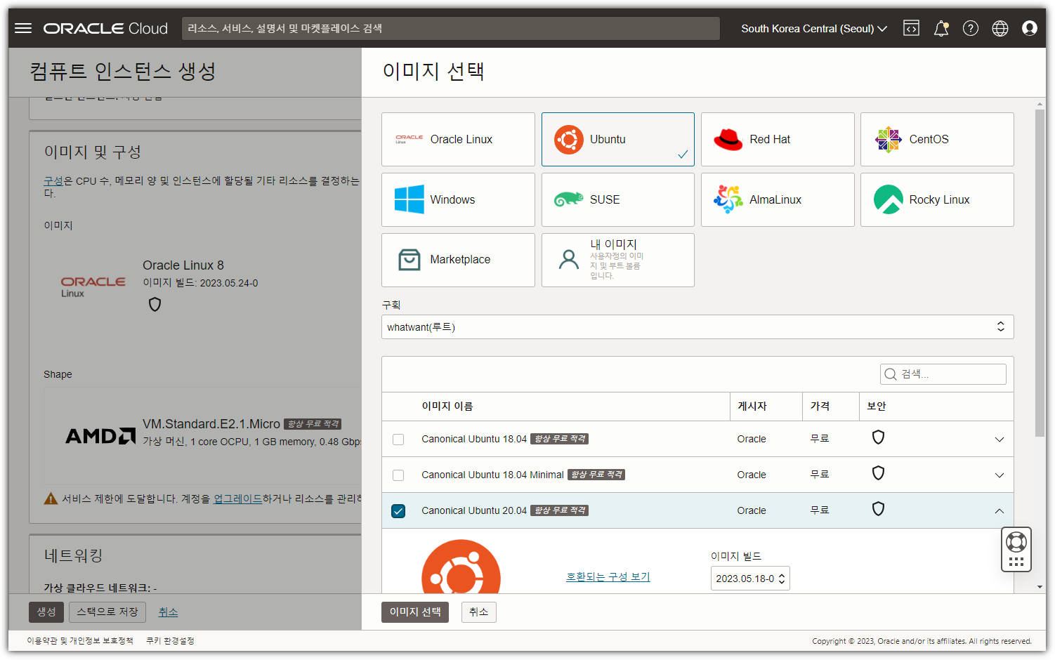 기본 이미지가 Orable Linux인데... 다른 배포판을 고를 수도 있다.