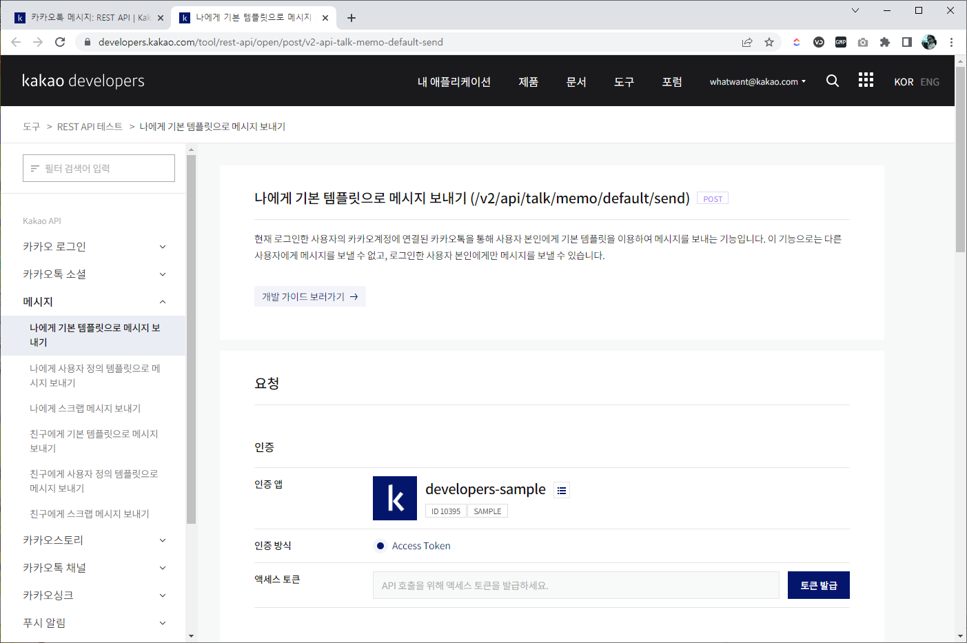 - "카카오톡 메시지:REST API" 페이지를 보면 바로 보이는 "REST API 테스트 도구"를 클릭하자.