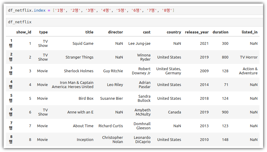 임의로 정해준 값이 아니라, 명시적인 값이 있는 Index 형태의 데이터로 되었다는 것을 확인할 수 있다.