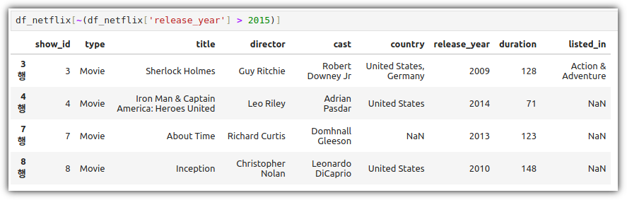 이것을 활용해서 원하는 열들의 특정 조건에 맞는 행 데이터들을 추출하는 방법은 다음과 같다.