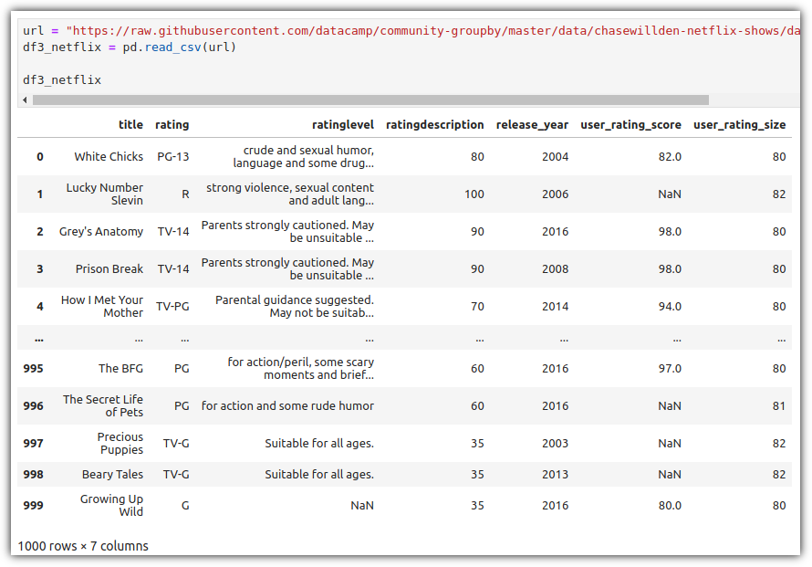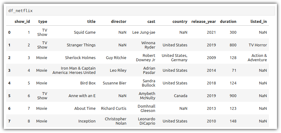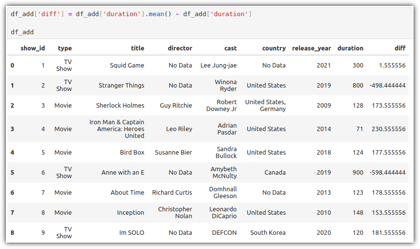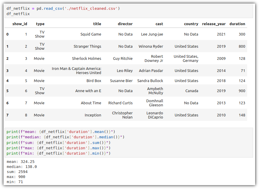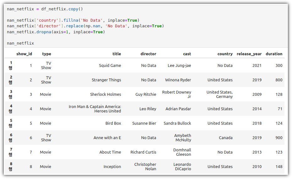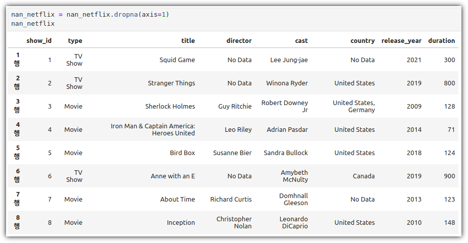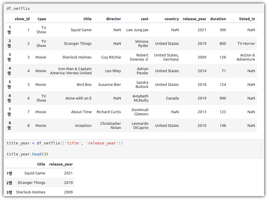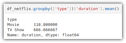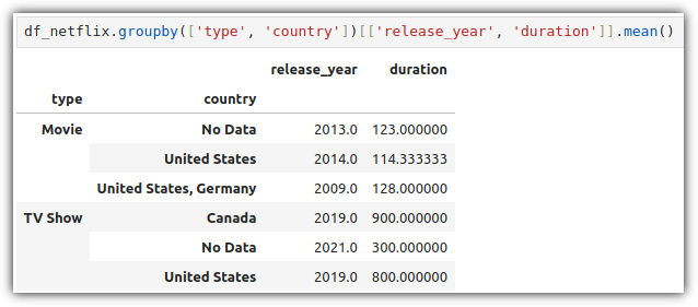 type 값이 "TV Show"인 row들에 대해서 "release_year" 값의 평균, "duration" 값의 합계를 구하려고 할 때