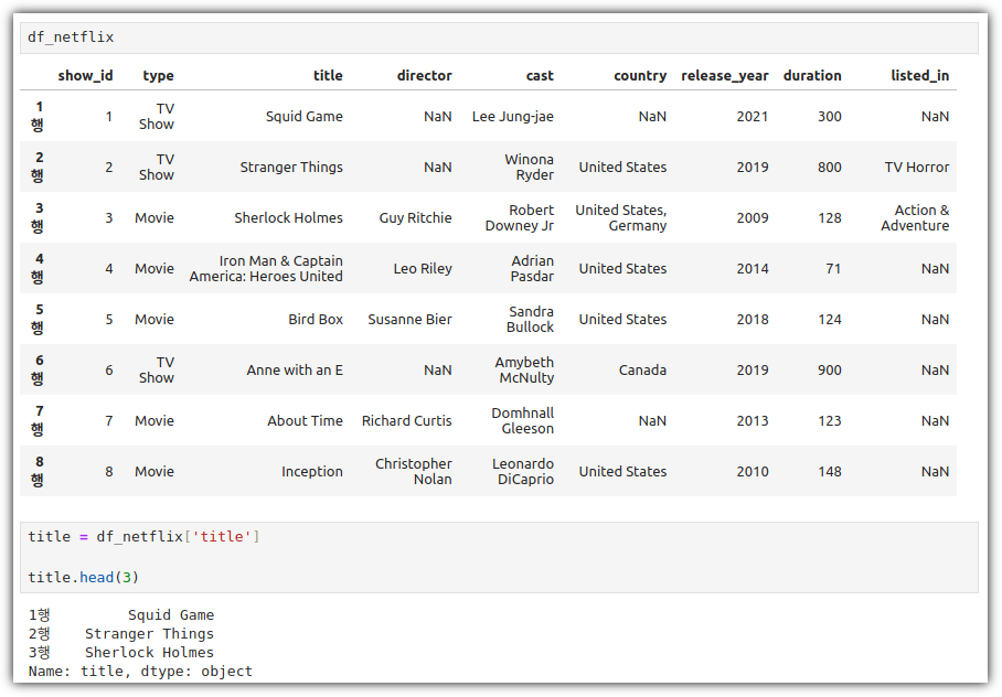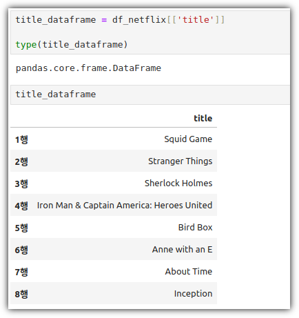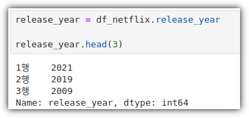 "DataFrame['column_name'] " 형식으로 했을 때 Series로 추출되었음을 확인할 수 있다.