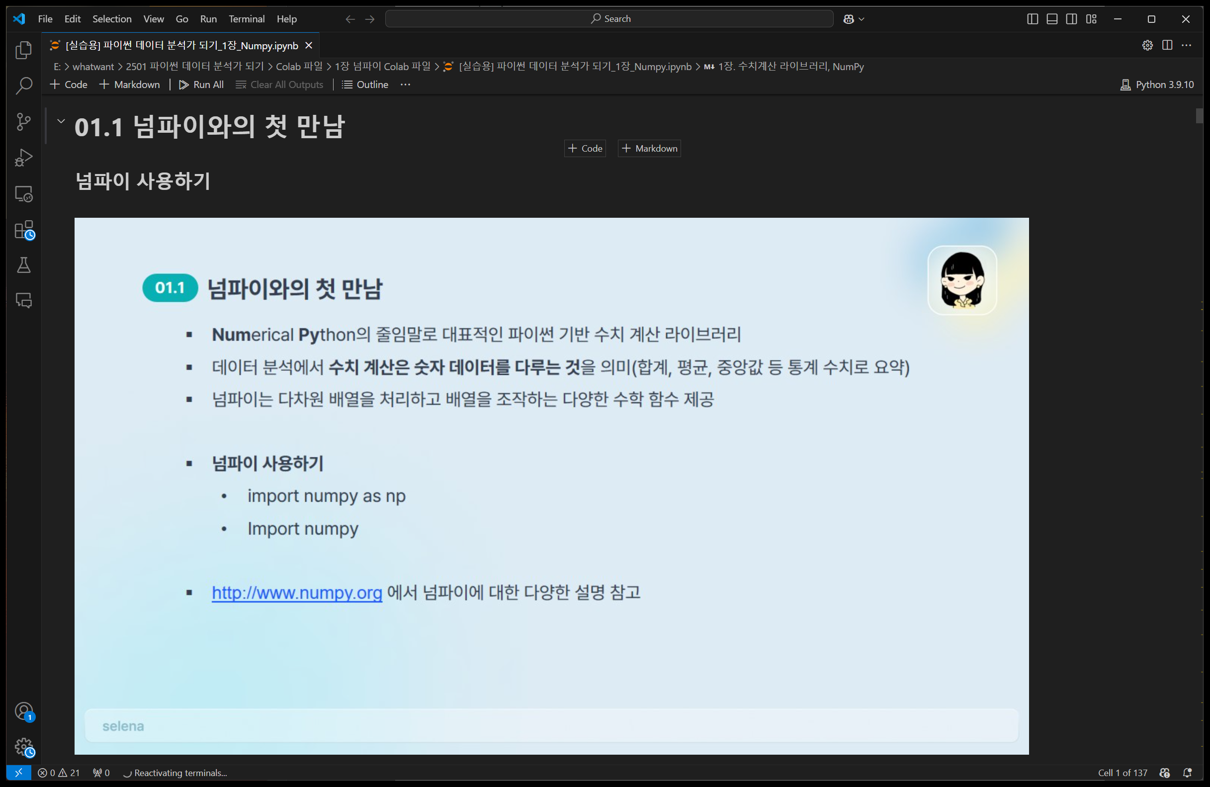 다만, Pandas도 Numpy를 기반으로 한다고 할 수도 있기에... 뭐 같이 공부한다고 손해볼 것은 없다.