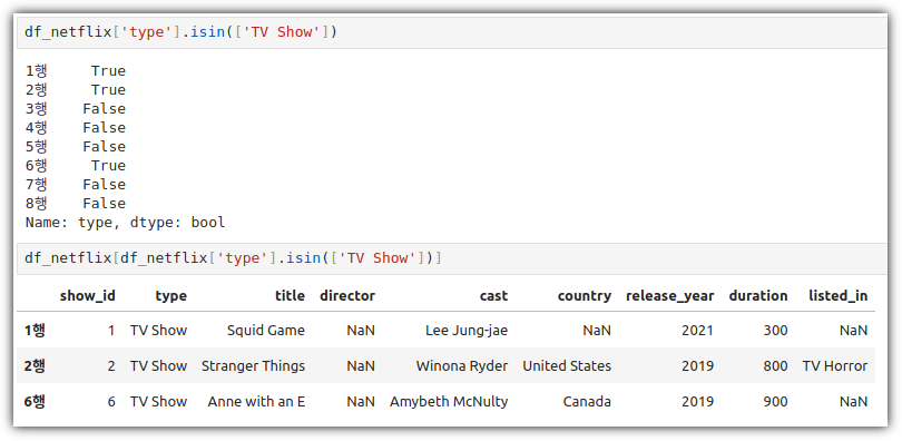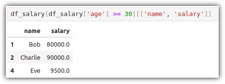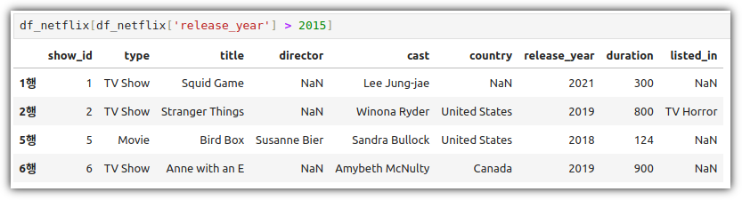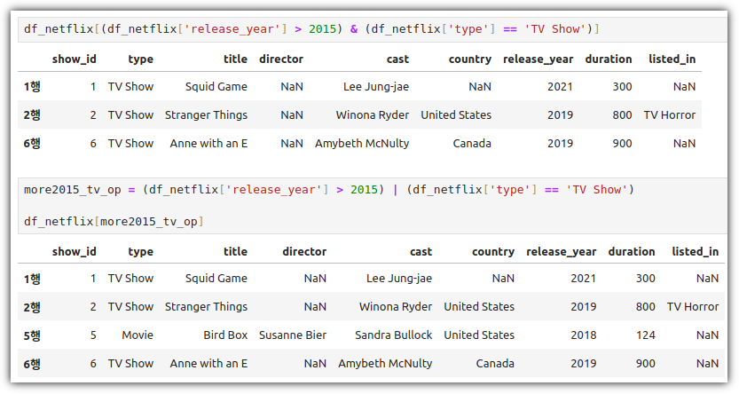 이것을 활용해서 원하는 열들의 특정 조건에 맞는 행 데이터들을 추출하는 방법은 다음과 같다.