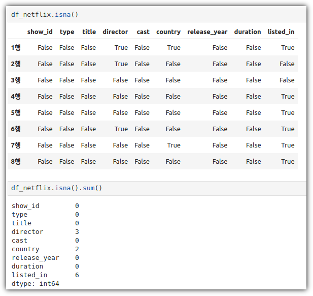 사실 알고 싶은 것은 각 column의 결측치 개수가 궁금하기에 .sum() 함수까지 붙여주는 것이 더 일반적이다.