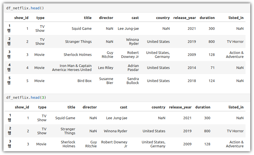 데이터 앞부분의 내역을 살펴보는 것은 head()를 사용하면 된다.