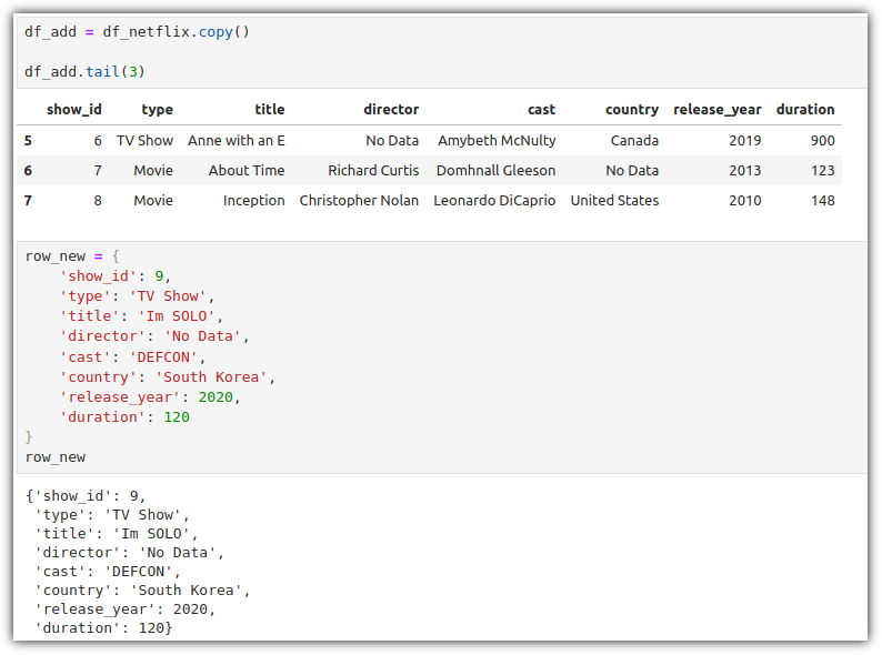 index 값을 가지고 새로운 row를 추가하는 것인데, iloc[]가 아닌 loc[]를 사용하고 있는 것을 조심해야 한다.