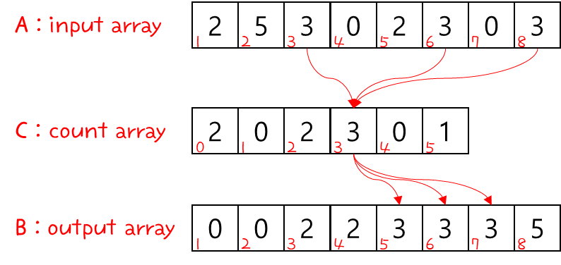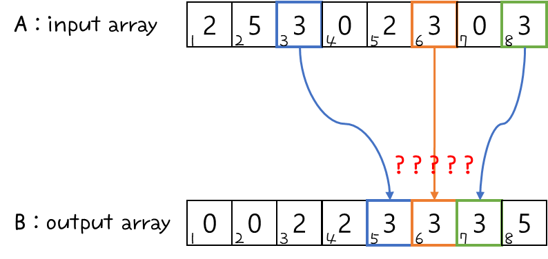 . 입력값(A array)의 3의 순서에 따라 출력값(B array)의 순서가 정해진다. → Stable 하다 !!!