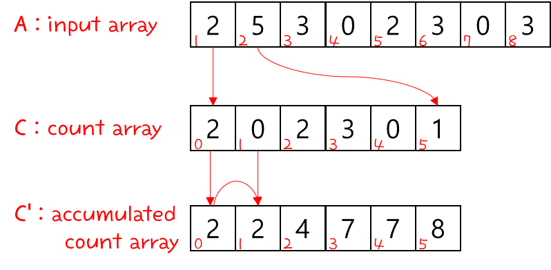 - Encoding ..... 기존 count array를 기반으로 누적값을 저장하는 C' array를 만들어줘야 한다.