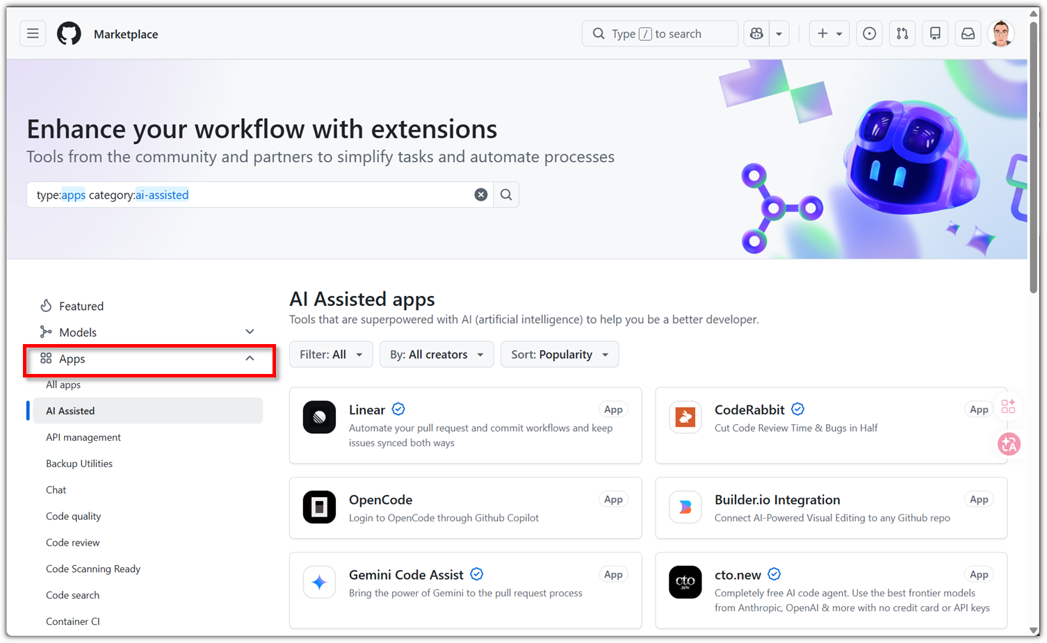 좀 더 편하게 살펴보기 위해 `AI Assisted` 카테고리를 선택하면 `Gemini Code Assist`를 발견할 수 있다.