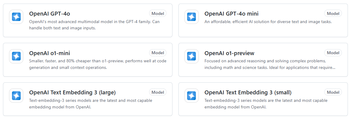 현재 GitHub Models에서 사용해볼 수 있는 model들은 다음과 같다.