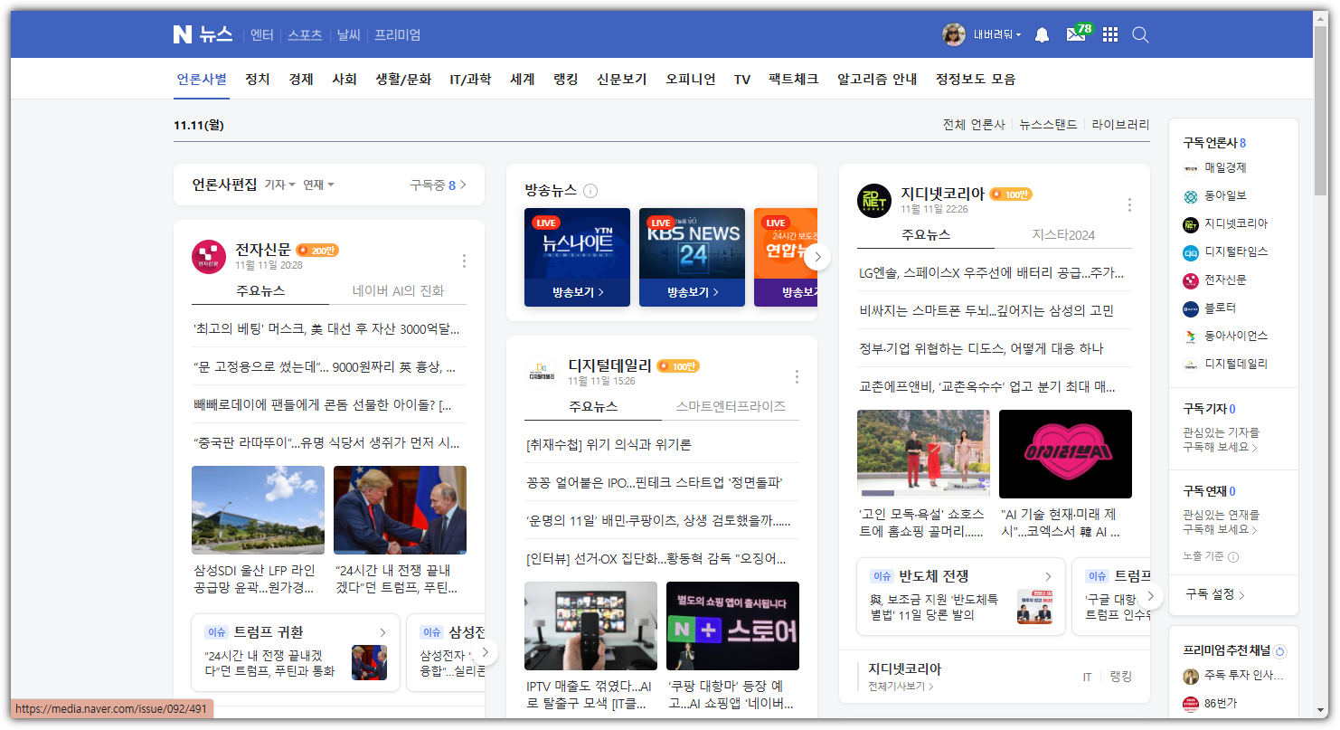 정치, 경제, 사회 등의 카테고리 별로 현재 상단에 있는 뉴스 제목들을 가지고 와봤다.