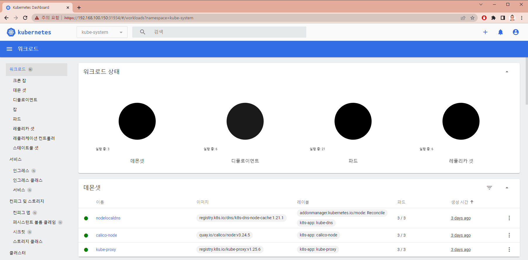 검색창 옆에 namespace 부분을 "kube-system"으로 변경해보자.