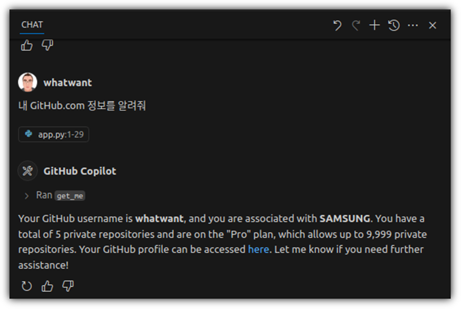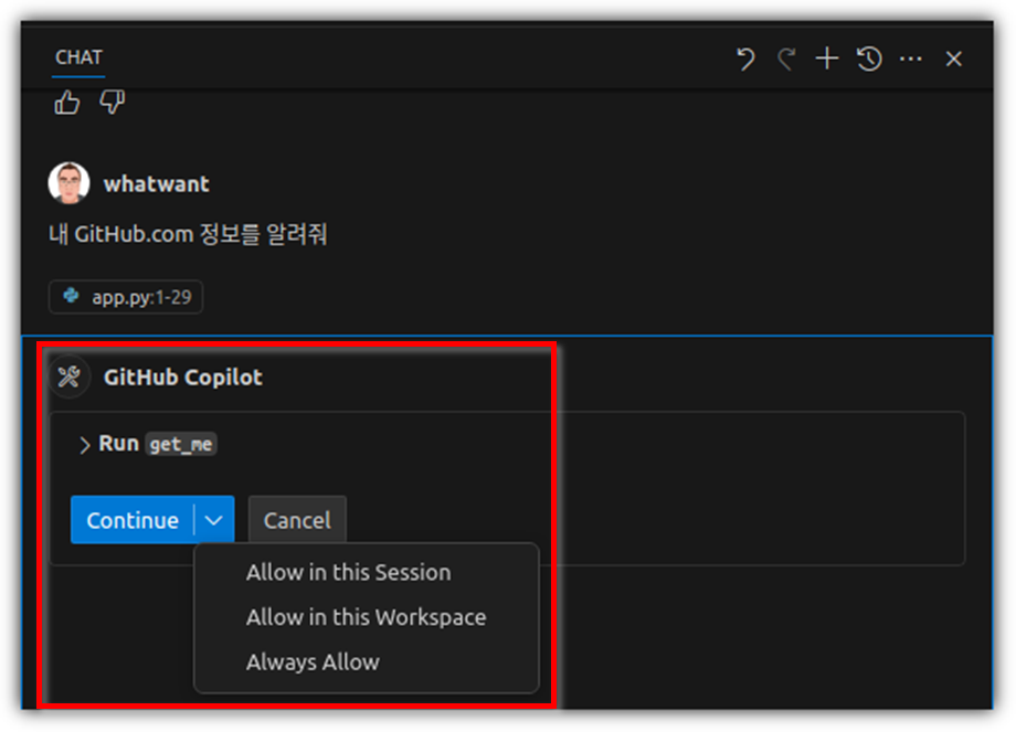 github.com의 내 정보를 알려달라고 했더니, "get_me"라는 도구를 찾아서 사용해도 되는지를 묻는다.