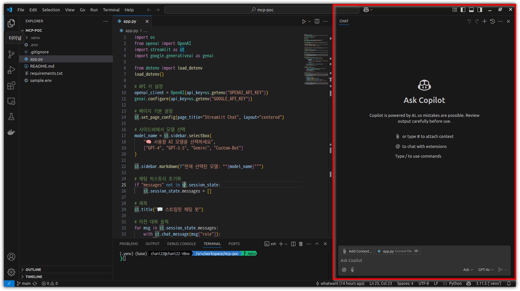 Agent 모드이기 때문에 채팅창을 벗어나 터미널 명령어들을 사용할 수도 있다.