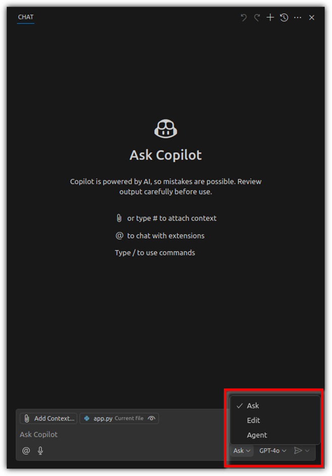 Ask / Edit / Agent 3가지 모드가 있는데, 지금 우리가 관심있는 것은 Agent 모드이다.