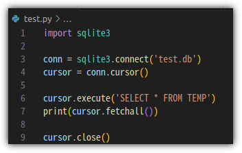 import sqlite3 conn = sqlite3.connect('test.db') cursor = conn.cursor() cursor.execute('SELECT * FROM TEMP') print(cursor.fetchall()) cursor.close() |