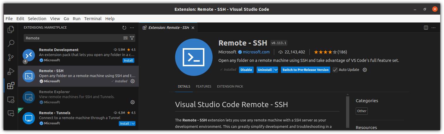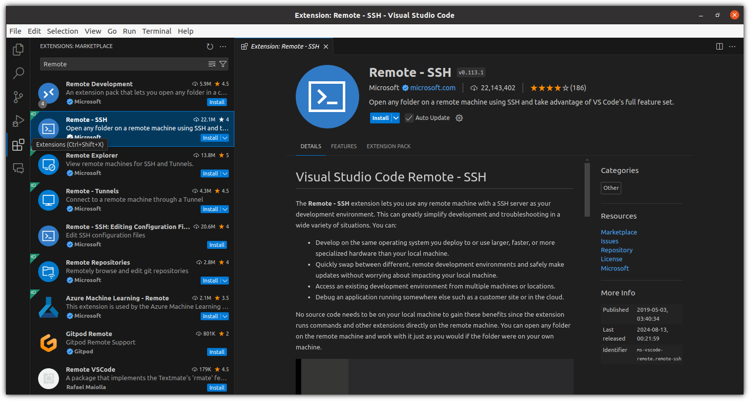- Extensions 중에서 "Remote - SSH"를 선택해서 설치해야 한다.