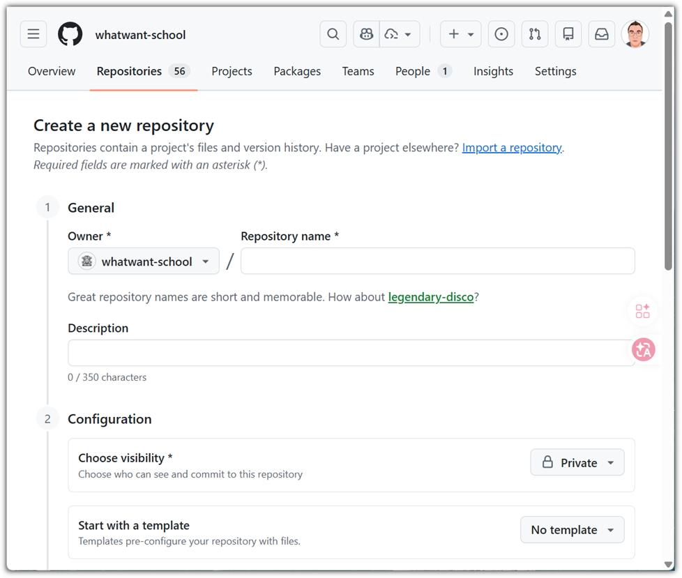 Organization에서 repository를 생성하는 것과