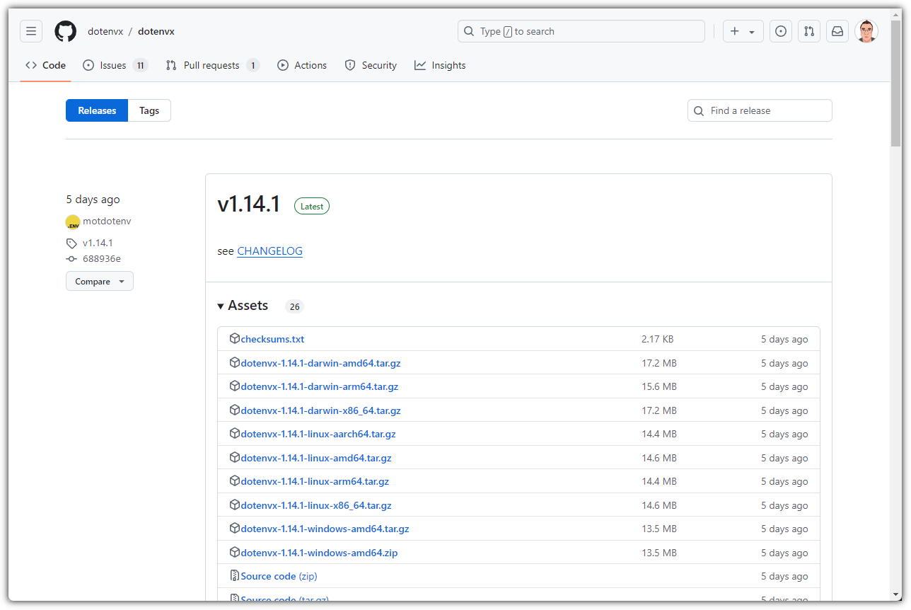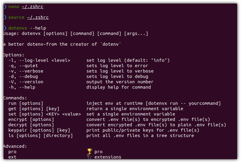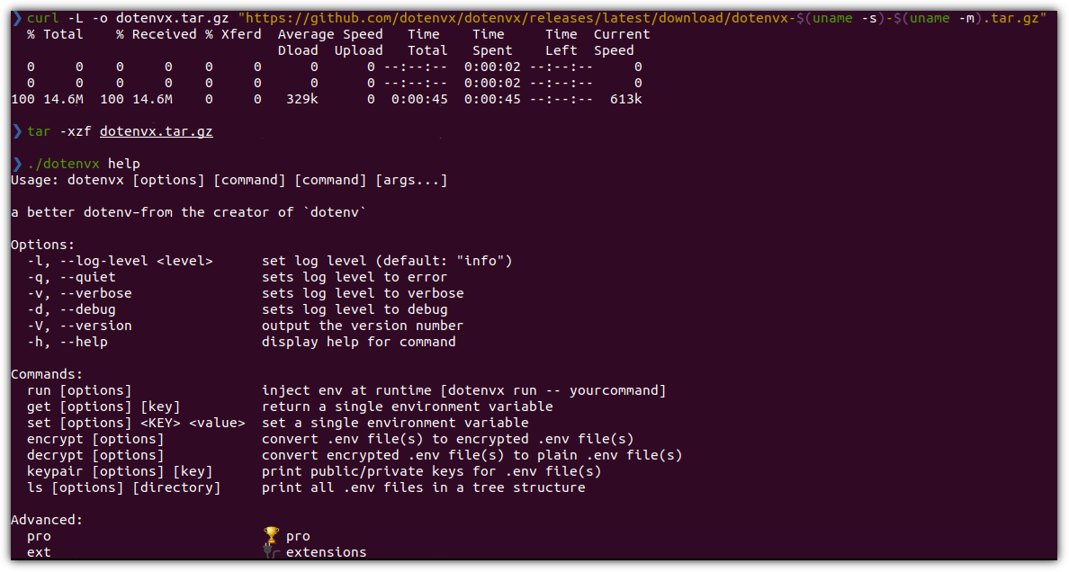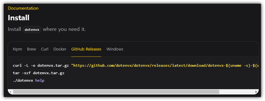 | > curl -L -o dotenvx.tar.gz "https://github.com/dotenvx/dotenvx/releases/latest/download/dotenvx-$(uname -s)-$(uname -m).tar.gz" > tar -xzf dotenvx.tar.gz > ./dotenvx help |