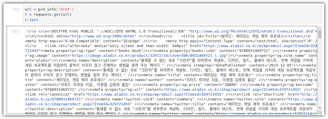 ⑤ requests.get() 함수로 다시 도서 상세 페이지의 HTML을 가져옵니다.