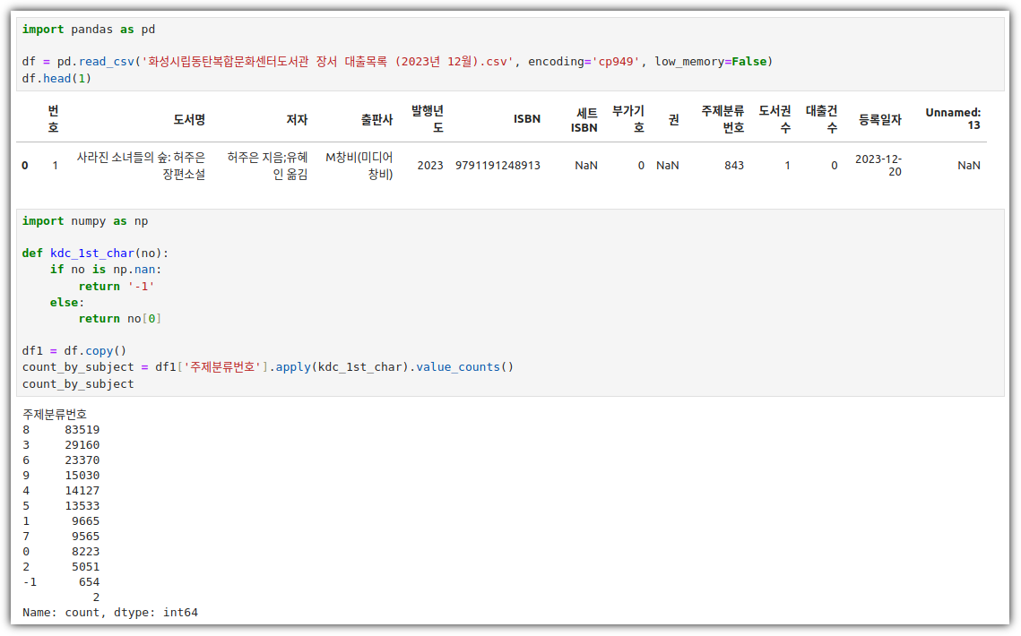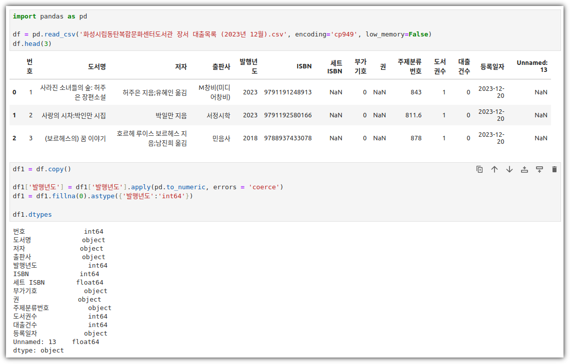 - 지난 번에 '발행년도'를 int64로 만들기 위해 별의별 짓을 다 했는데 ... 간단히 끝냈다. 이런....