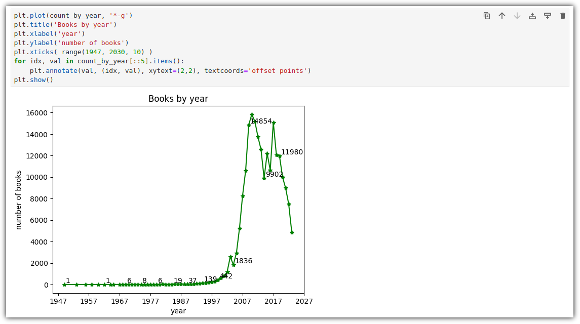 | plt.plot(count_by_year, '*-g') plt.title('Books by year') plt.xlabel('year') plt.ylabel('number of books') plt.xticks( range(1947, 2030, 10) ) for idx, val in count_by_year[::5].items(): # plt.annotate(val, (idx, val), xytext=(idx+1, val+10)) plt.annotate(val, (idx, val), xytext=(2, 2), textcoords='offset points') plt.show() |