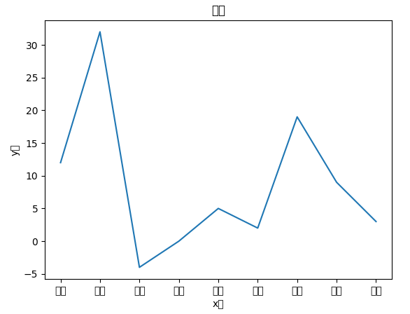 | import pandas as pd import matplotlib.pyplot as plt import matplotlib as mpl import warnings warnings.simplefilter(action='ignore', category=UserWarning) plt.rc('font', family='NanumBarunGothic') mpl.rcParams['axes.unicode_minus'] = False plt.plot(['서울', '경기', '인천', '광주', '대구', '부산', '울산', '대전', '제주'], [12, 32, -4, 0, 5, 2, 19, 9, 3]) plt.xlabel('x축') plt.ylabel('y축') plt.title('제목') plt.savefig('test.png') |