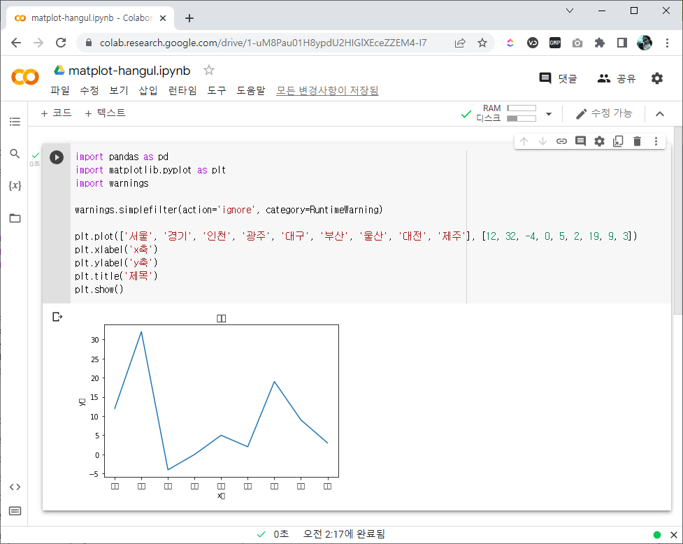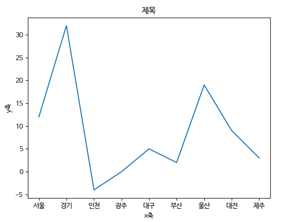 | import pandas as pd import matplotlib.pyplot as plt import warnings warnings.simplefilter(action='ignore', category=UserWarning) plt.plot(['서울', '경기', '인천', '광주', '대구', '부산', '울산', '대전', '제주'], [12, 32, -4, 0, 5, 2, 19, 9, 3]) plt.xlabel('x축') plt.ylabel('y축') plt.title('제목') plt.savefig('test.png') |