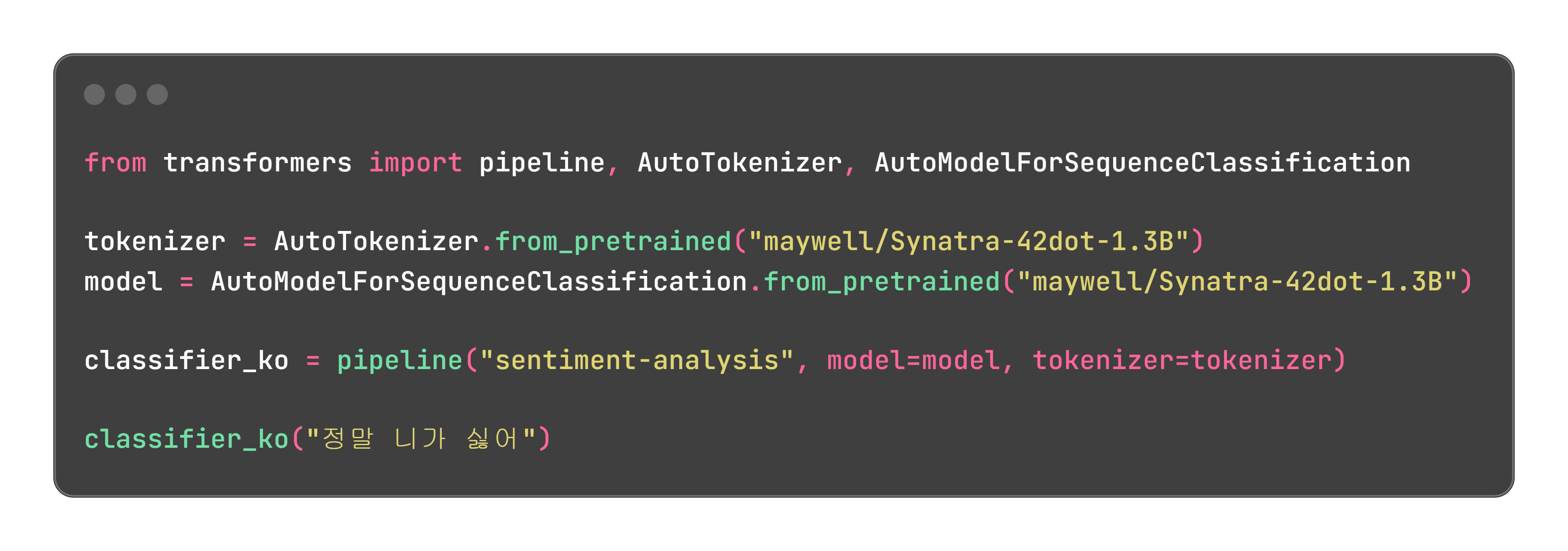classifier_ko = pipeline("sentiment-analysis", model=model, tokenizer=tokenizer)