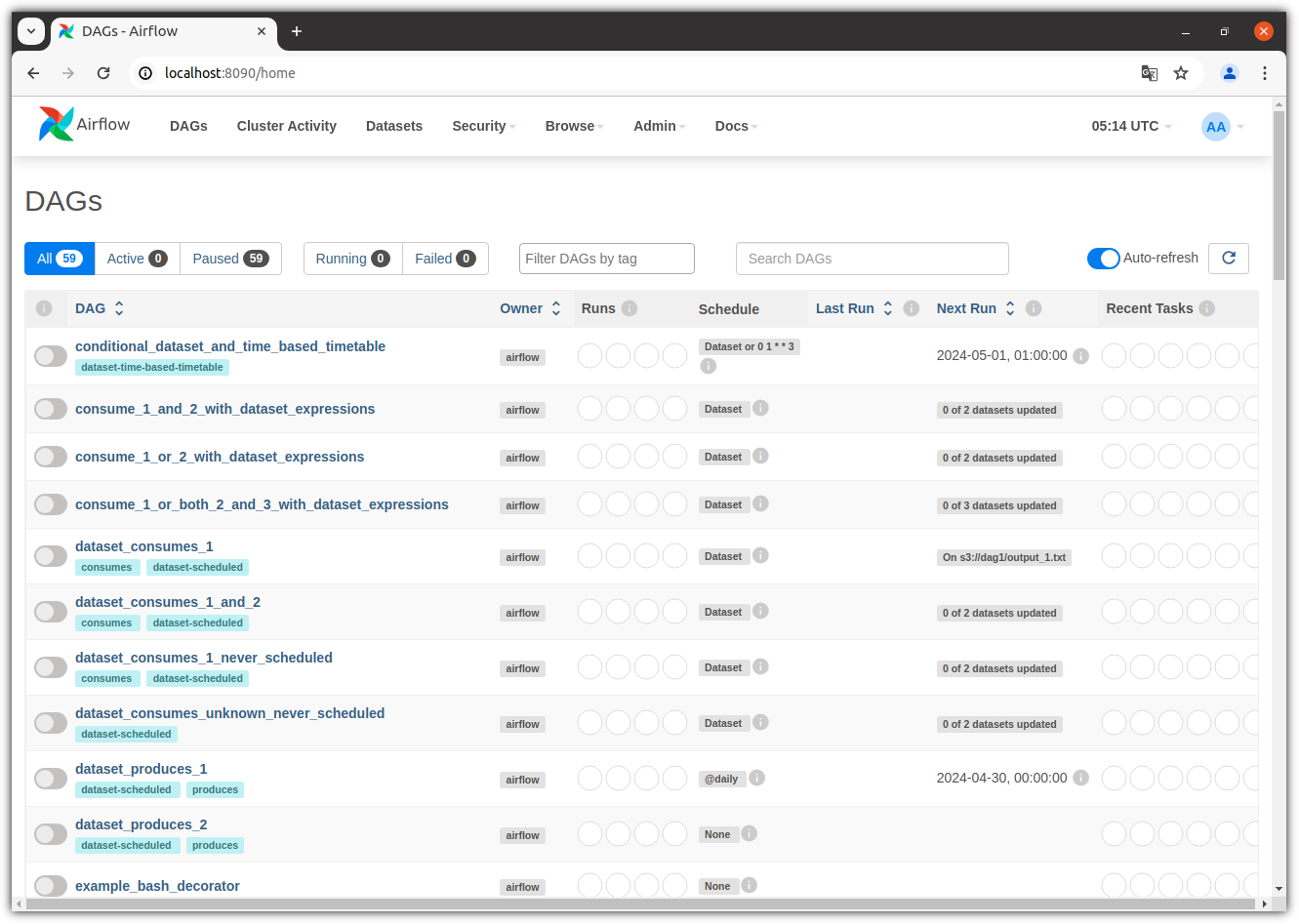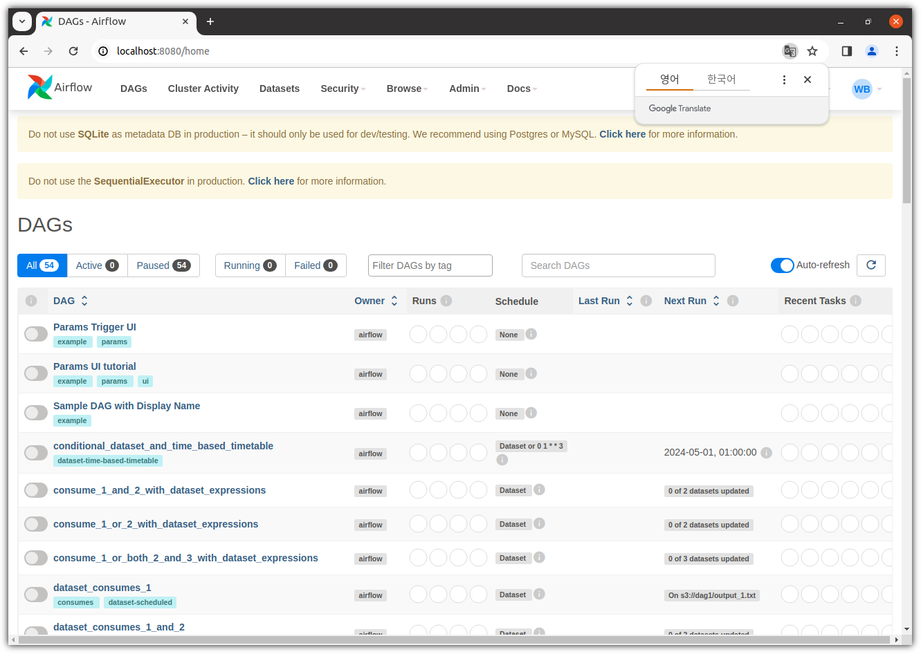 - 웹브라우저를 reload(F5) 하면 갑자기 못보던 샘플 DAGs 가 보인다.