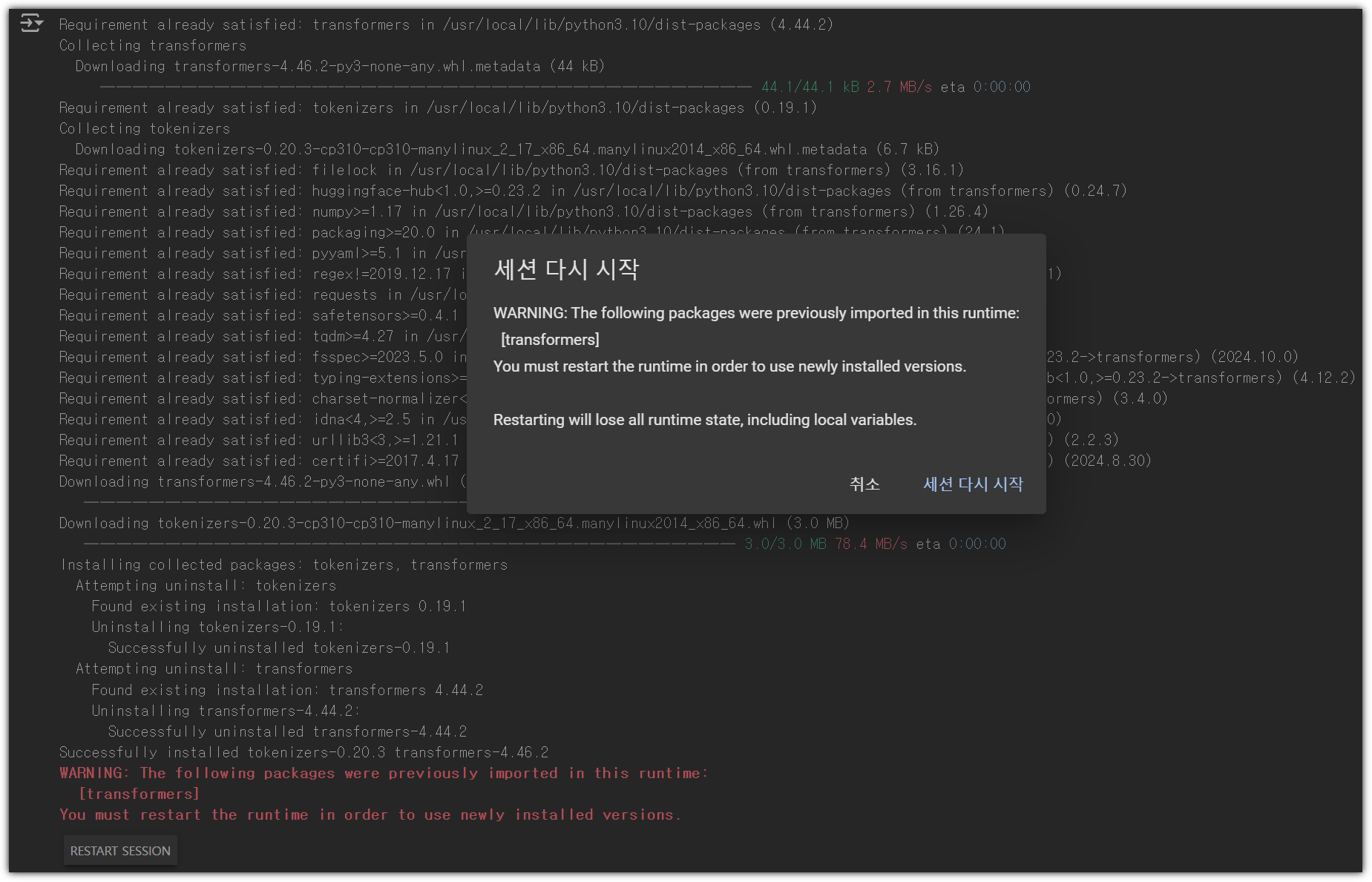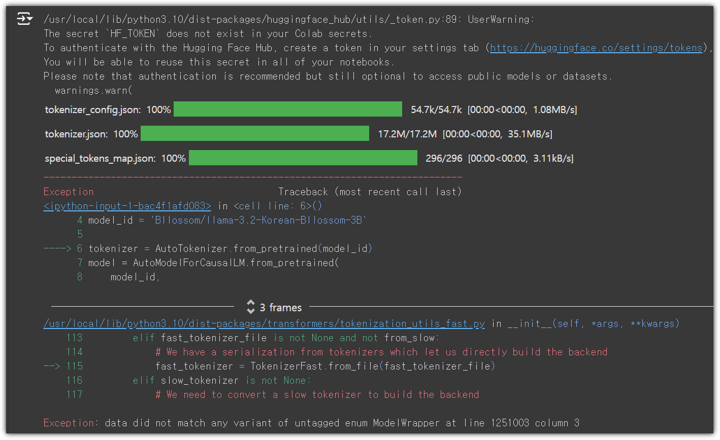 현재는 transformers, tokenizers 버전이 낮아서 발생하는 것으로 보인다.