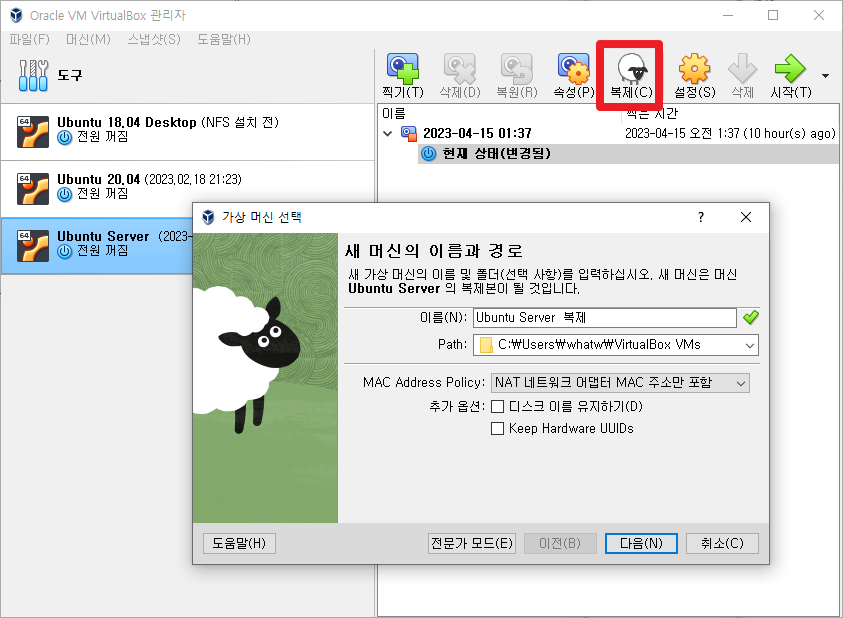 그래서 VirtualBox의 머신 복제 기능을 이용해보고자 한다.