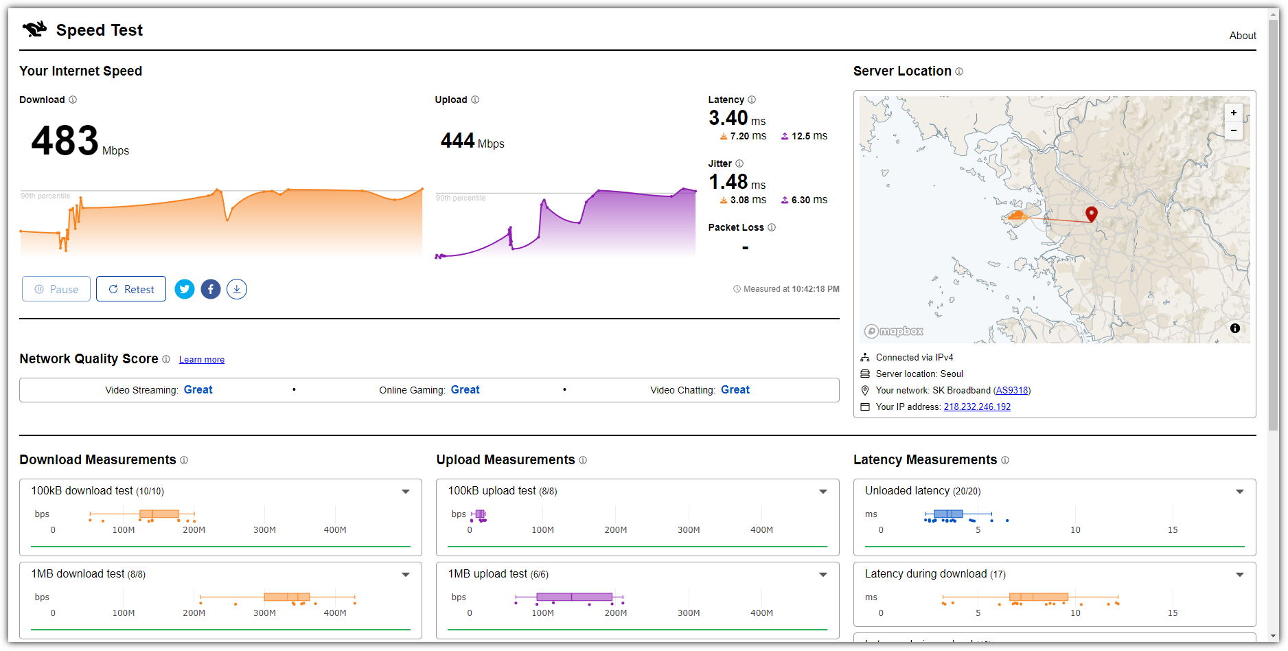 CDN/DNS 서비스 분야에 있어서는 전세계의 1/5 이상이 사용하고 있다는 클라우드플레어의 속도 측정 서비스