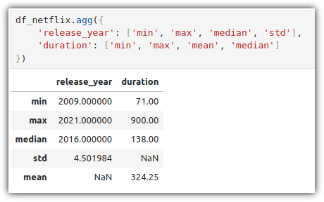 type 값이 "TV Show"인 row들에 대해서 "release_year" 값의 평균, "duration" 값의 합계를 구하려고 할 때