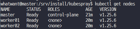 | (master)$ kubectl cluster-info Kubernetes control plane is running at https://127.0.0.1:6443 To further debug and diagnose cluster problems, use 'kubectl cluster-info dump'. (master)$ kubectl get nodes NAME STATUS ROLES AGE VERSION master Ready control-plane 21m v1.25.6 worker01 Ready <none> 20m v1.25.6 worker02 Ready <none> 20m v1.25.6 |