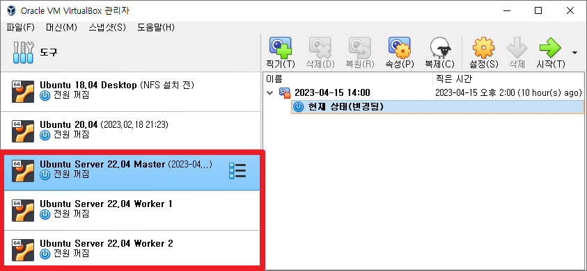 VirtualBox의 장점을 살리기 위해서는 안전한 진행을 위해 snapshot 한 번 찍어주는 것도 좋다.