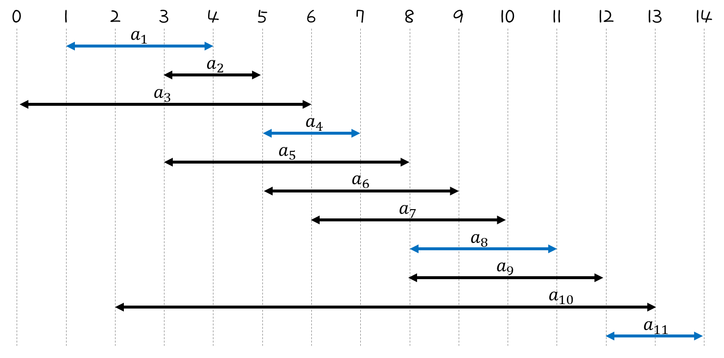 서로 겹치지 않고 동시에 할 수 있는 activities 중 가장 큰 subset을 선택하는 문제는 어떻게 풀면 좋을까?