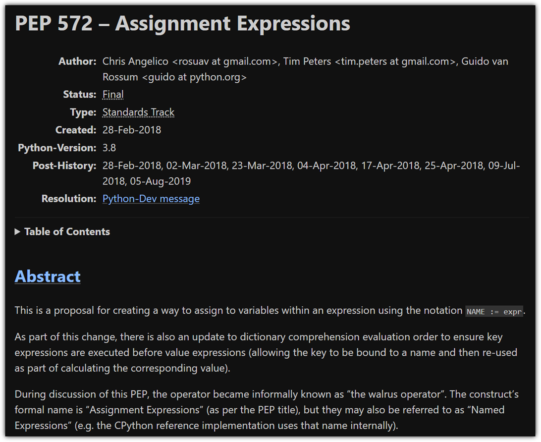 - 결국은 승인되어 파이썬 3.8에 도입되었지만, Guido는 BDFL 모델을 내려놓게 되었고