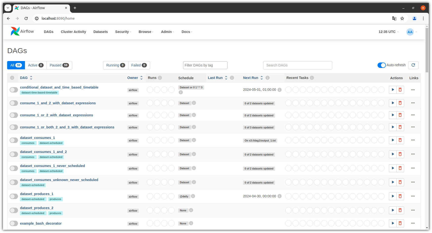 - 웹브라우저를 reload(F5) 하면 갑자기 못보던 샘플 DAGs 가 보인다.