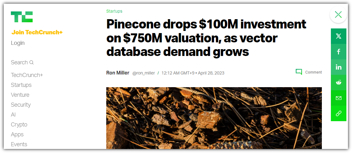 출처: https://techcrunch.com/2023/04/27/pinecone-drops-100m-investment-on-750m-valuation-as-vector-database-demand-grows/?utm_source=oneoneone