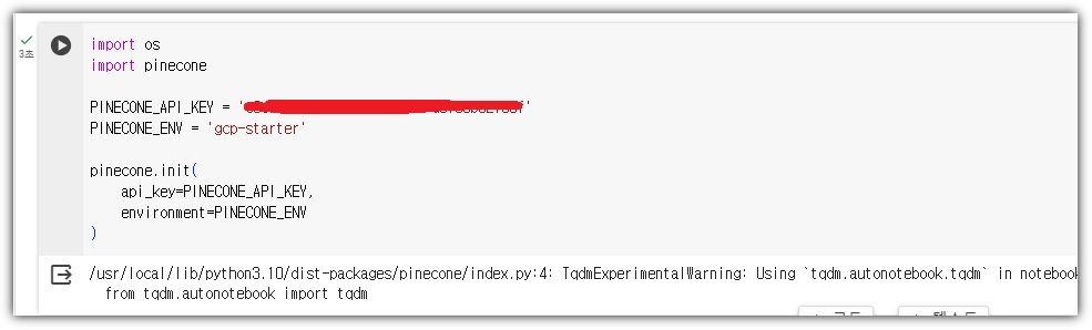 - 앞에서 이미 Pinecone API Key 및 Env 값은 확보(?)했으니 이 부분은 Pass