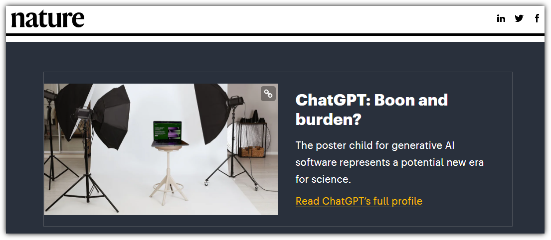 국제학술지 '네이처(Nature)'에서 올 한 해 과학계에 큰 화제를 불러일으킨 10명의 인물을 선정하는 '네이처 10(Nature's 10)'을 발표했는데, 역대 최초로 인간이 아닌 생성형 인공지능(AI) 챗봇 '챗GPT(ChatGPT)'를 포함시켰다.